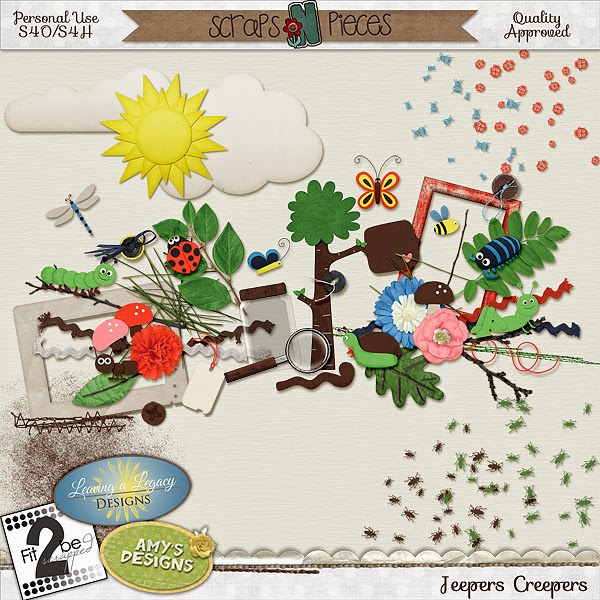 This month for the mid-moth collab, 3 of my favorite designers got together and made a kit that I have been begging any designer to make. LEaving a Legacy Designs, Fit 2 Be Scrapped, and Amy's Designs made this fabulous kit called "Jeepers Creepers" If you have a little boy, you NEED this kit. It is about BUGS!!! My little guy loves to dig in the dirt for roly ponies and worms and then chase grasshoppers when they come around. I saw a picture his preschool teacher took of him torturing a little girl with a worm....I wish I would have had that picture for this release =) Even if you don't have boys, there are some girly elements too....butterflies, ladybugs, pink flowers, and girls like bugs too. =) So go grab your kit because now that summer is coming, there will be lots of kids playing outside....and playing outside means bugs....=)